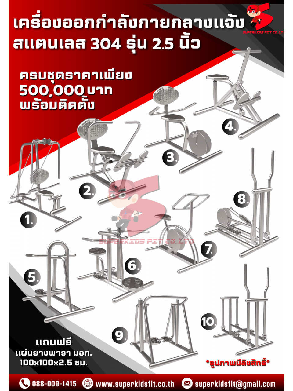 เครื่องออกกำลังกายกลางแจ้งสแตนเลส 10 เครื่อง พร้อมติดตั้งแผ่นยางพารา (มอก.2682-2563) 100x100x2.5 ซม.